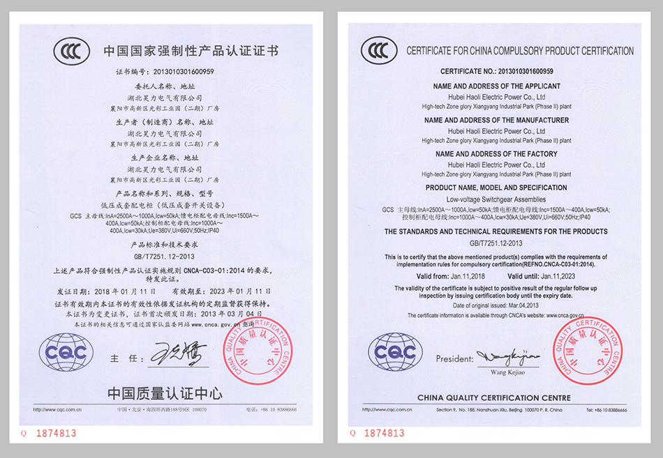 低压成套配电柜证书